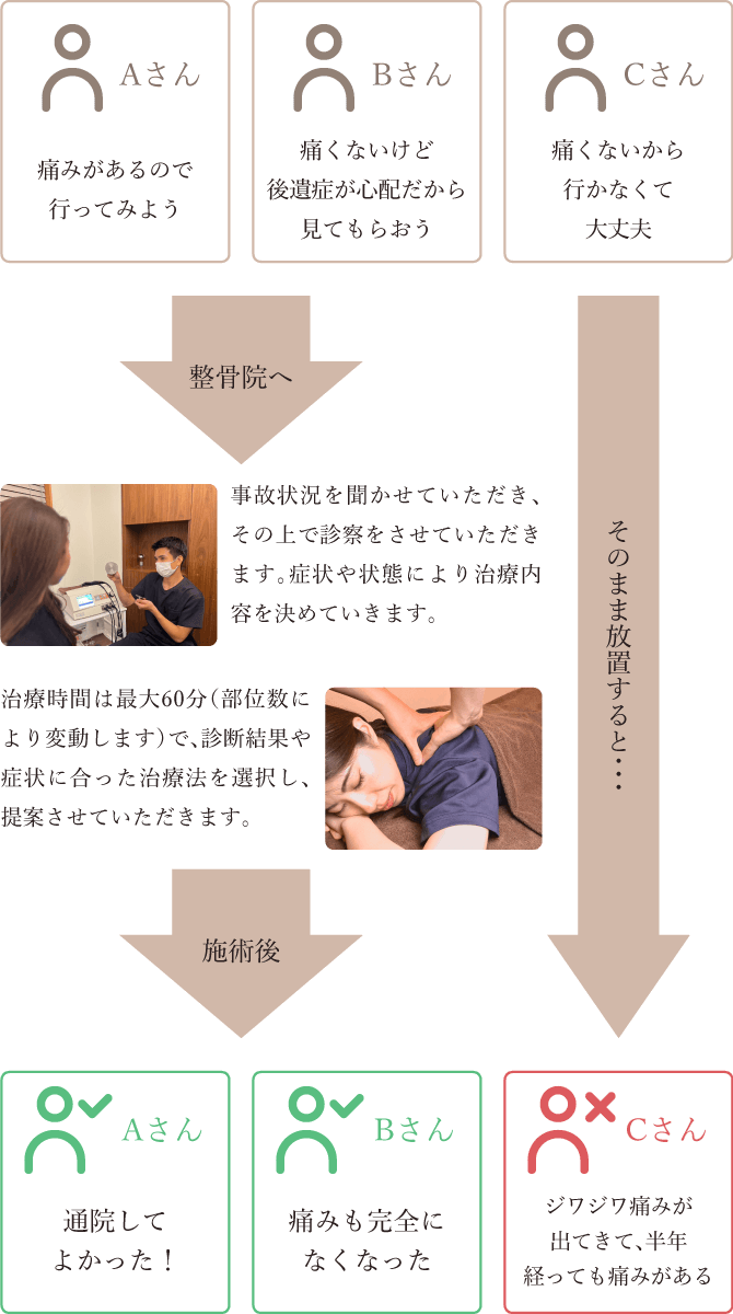 早期に痛みがひいたとしても、交通事故によるお怪我は数ヵ月後に症状が現れたり悪化してしまうこともあるため、 焦らず時間をかけて治療をしていきましょう。